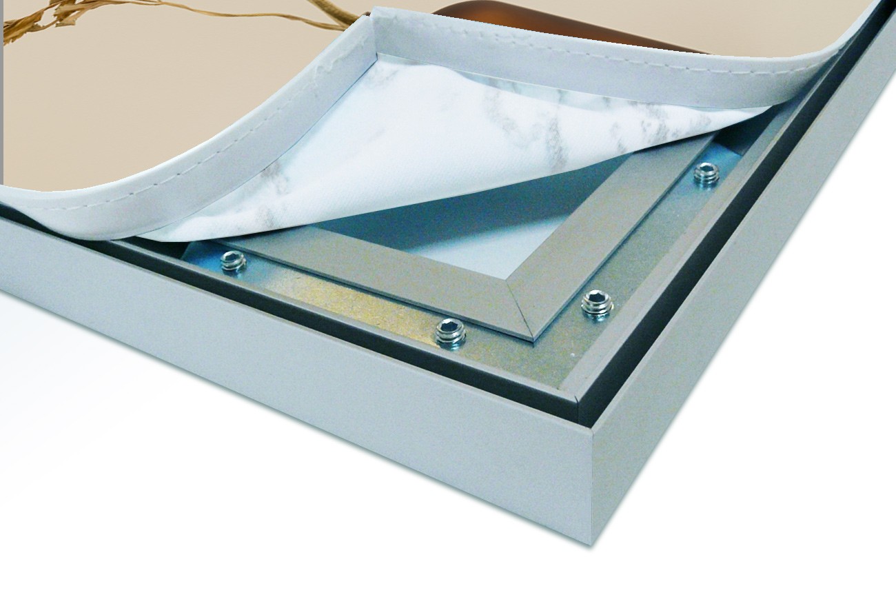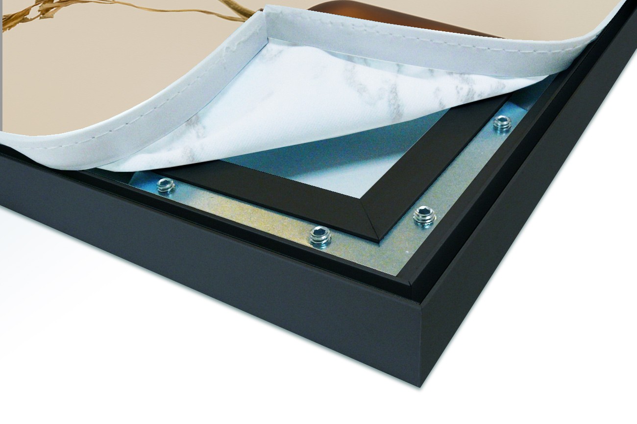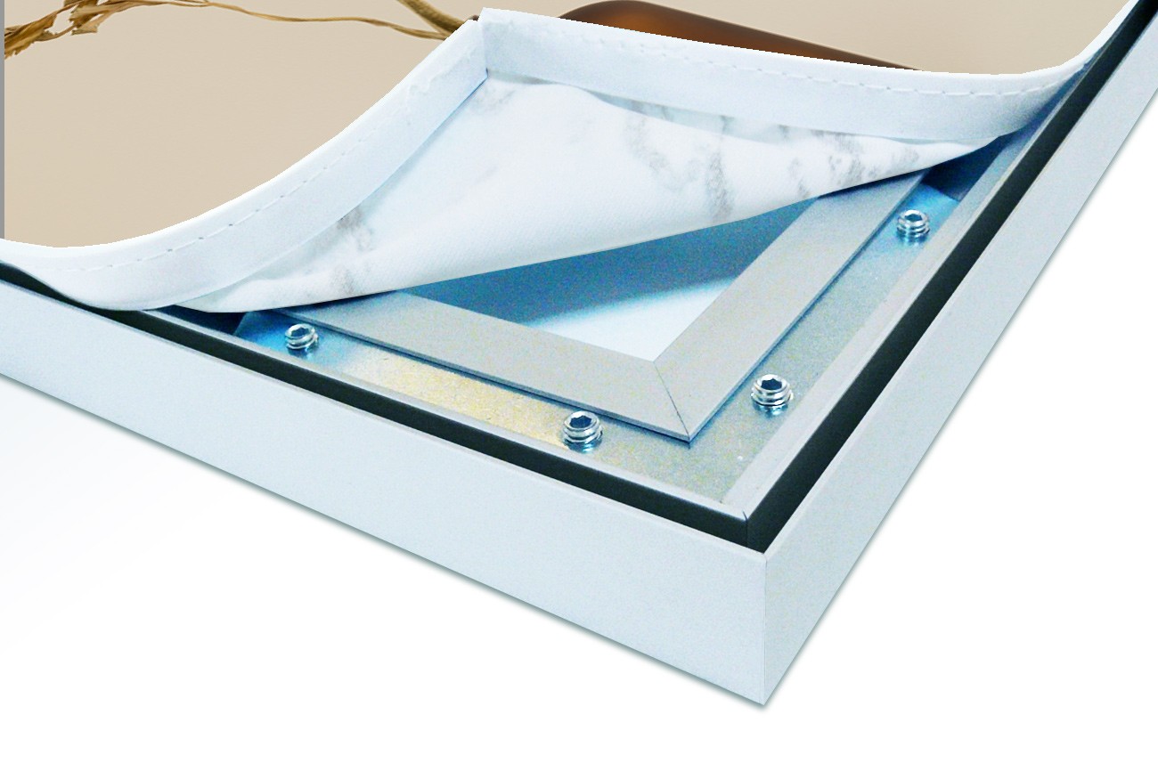 Het aluminium XL Wall Art frame is vanaf de zijde gezien 25 mm hoog, vanaf de voorzijde van de XL Wall Art zie je slechts een aluminium rand van circa 1 mm. De print wordt d.m.v. de sublimatie methode in en op het XL Wall Art doek (220 grams decostof) aangebracht en waarna het doek aan de achterzijde wordt voorzien van een rubber pees. Hierdoor is het werk gemakkelijk in het XL Wall Art frame te plaatsen.
