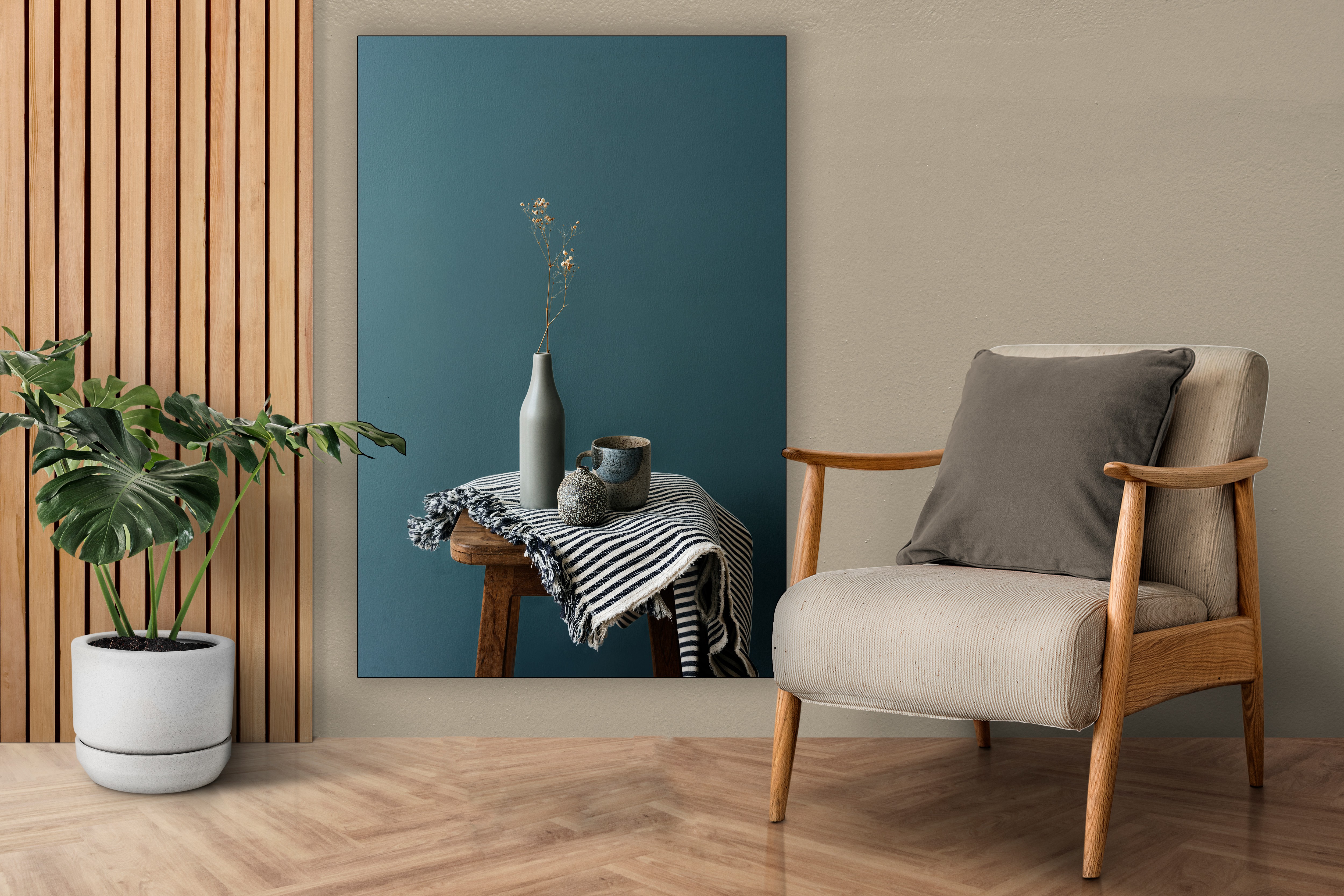 Fotografie van moderne stillevens zijn op dit moment heel populair. In de 17e eeuw werden dit soort schilderijen vaker gebruikt om het huis op te fleuren. Het kopen van een schilderij met stillevens was vaak namelijk goedkoper dan het kopen van porselein of exotische bloemen. De kleuren compositie heeft een hele neutrale uitstraling, die met de koude kleuren van de achtergrond samenvallen. Het geheel heeft een hele zachte belichting wat vaker werd gebruikt in stillevens. Dit werk is beschikbaar in verschillende formaten op textieldoek inclusief textielframe.