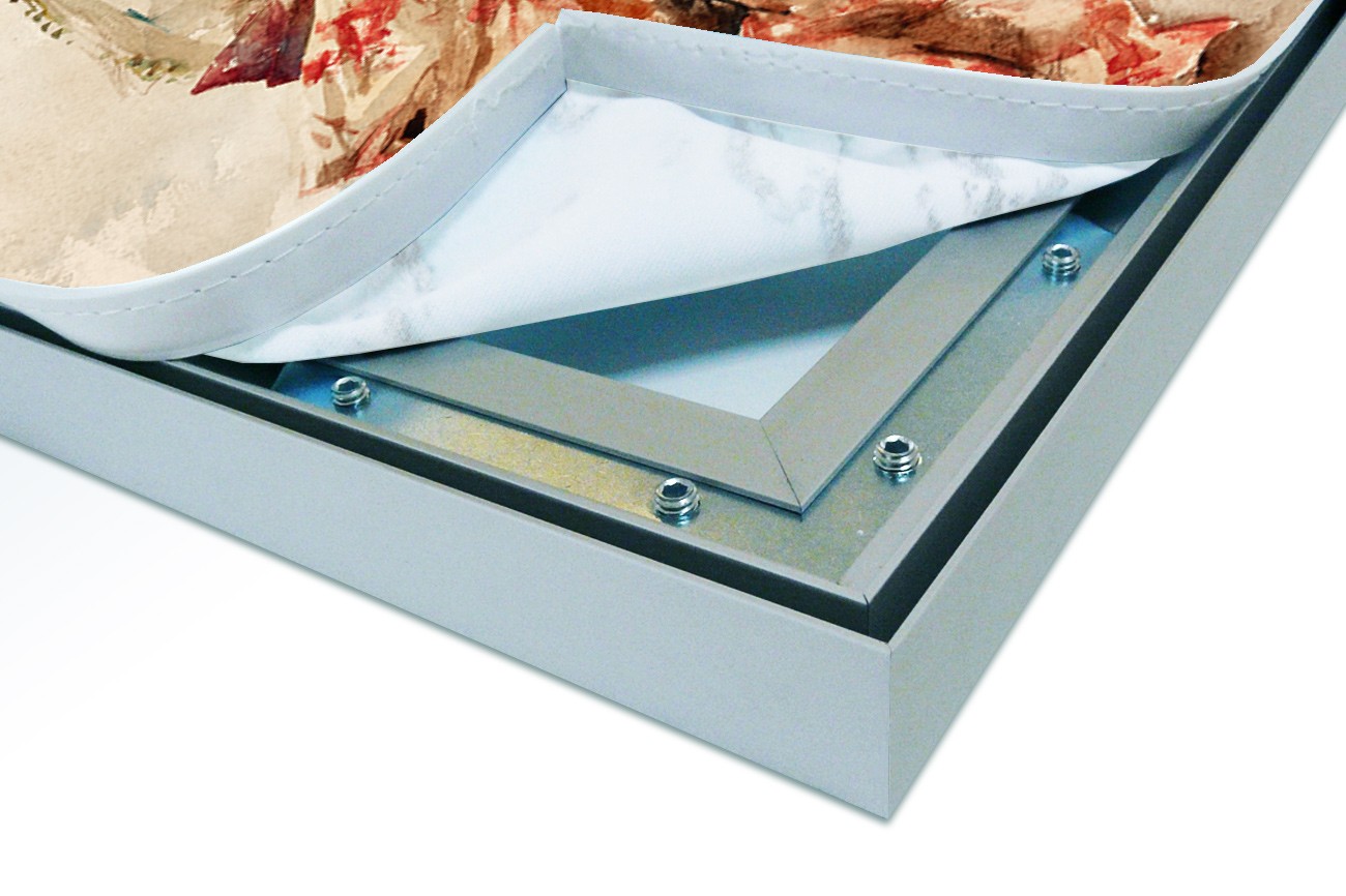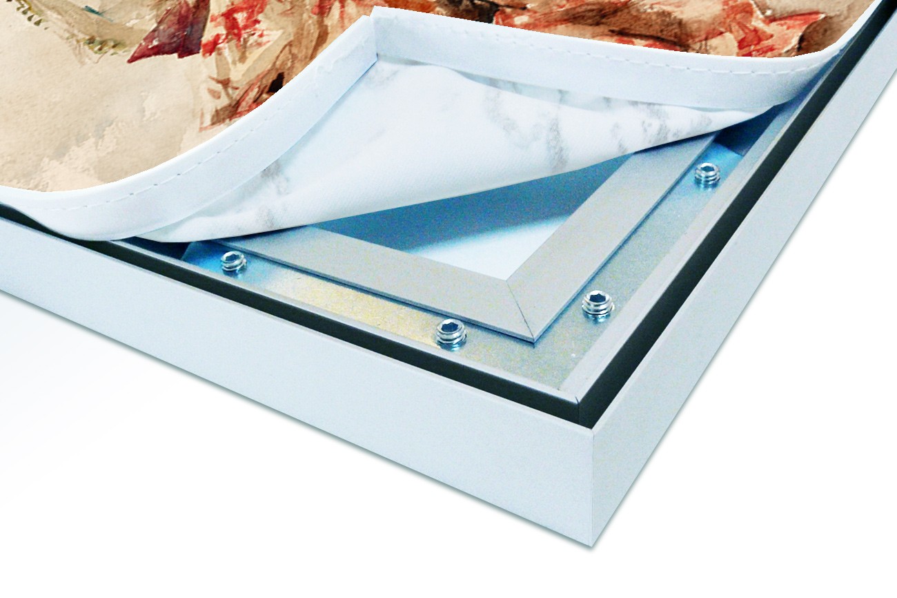 Het aluminium XL Wall Art frame is vanaf de zijde gezien 25 mm hoog, vanaf de voorzijde van de XL Wall Art zie je slechts een aluminium rand van circa 1 mm. De print wordt d.m.v. de sublimatie methode in en op het XL Wall Art doek (220 grams decostof) aangebracht en waarna het doek aan de achterzijde wordt voorzien van een rubber pees. Hierdoor is het werk gemakkelijk in het XL Wall Art frame te plaatsen.