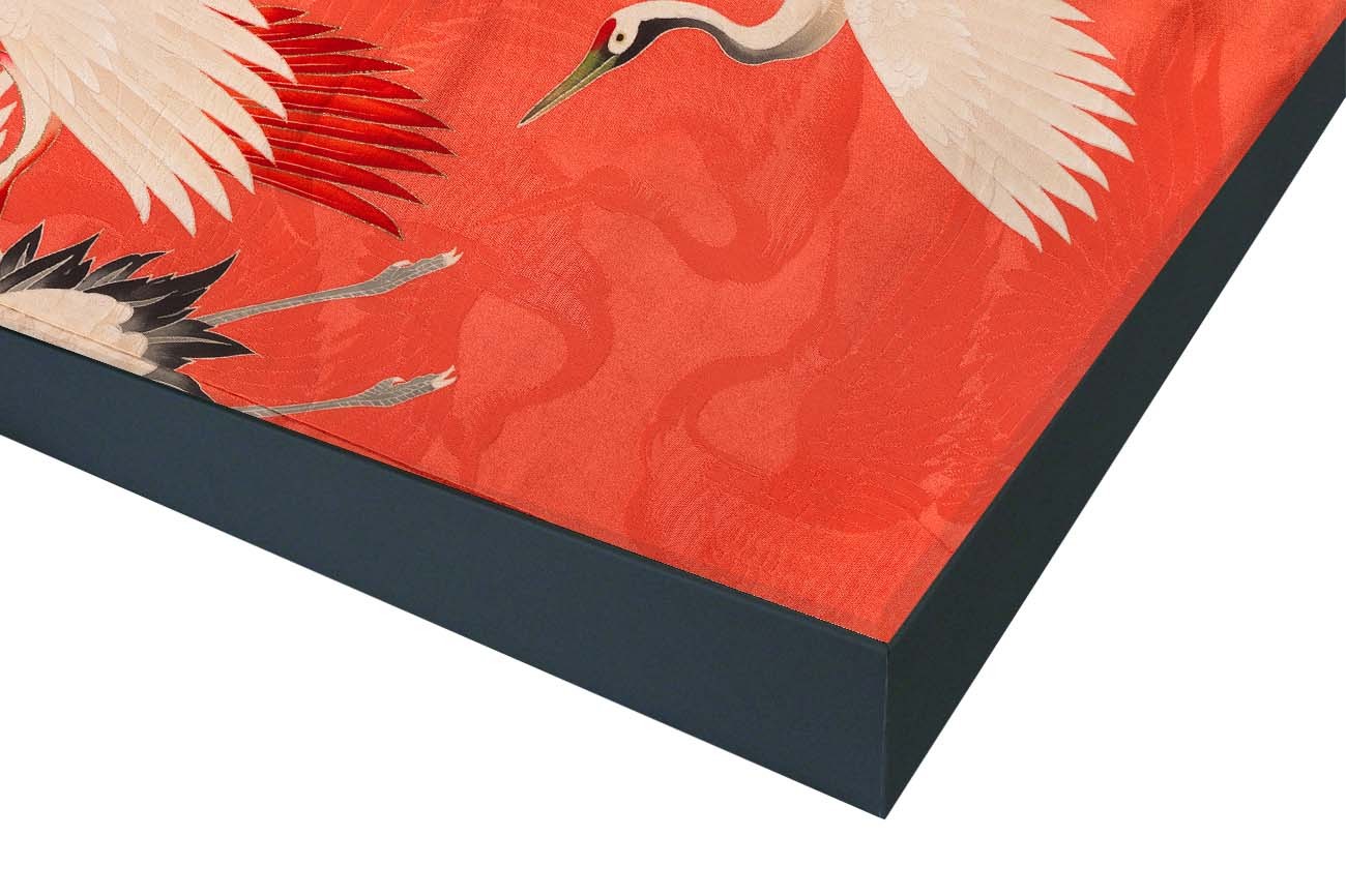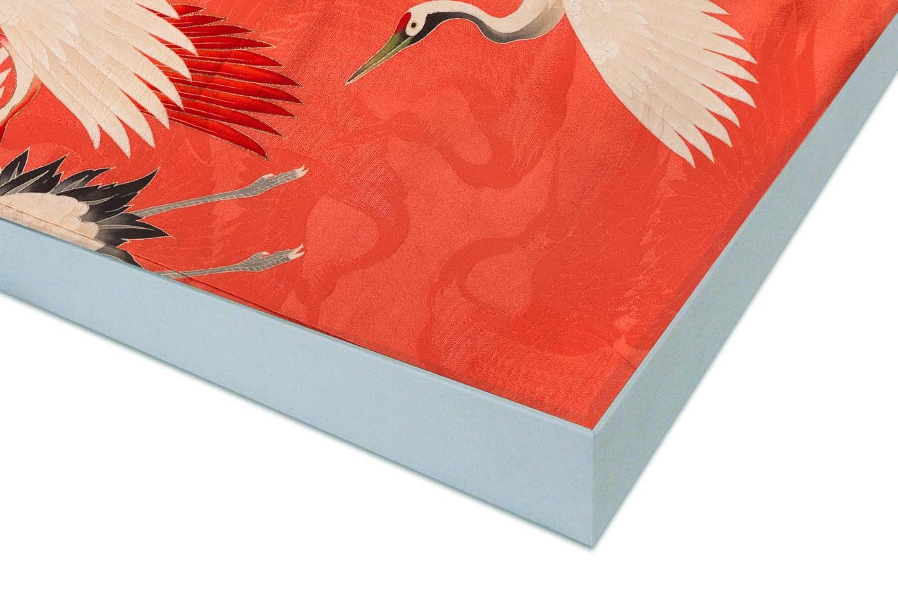 Deze print is gemaakt voor een Haori, traditionele Japanse kimono, die gedragen wordt door een vrouw. De Haori is gemaakt tussen 1920 en 1940 in Japan. De bijzondere kleuren en details van de vogels verwijzen naar de Kacho-ga stijl. Een Japanse schilderijen en print stijl uit de 20e eeuw. White and red Cranes, van een anonieme kunstenaar, is beschikbaar in verschillende formaten op textieldoek inclusief textielframe.